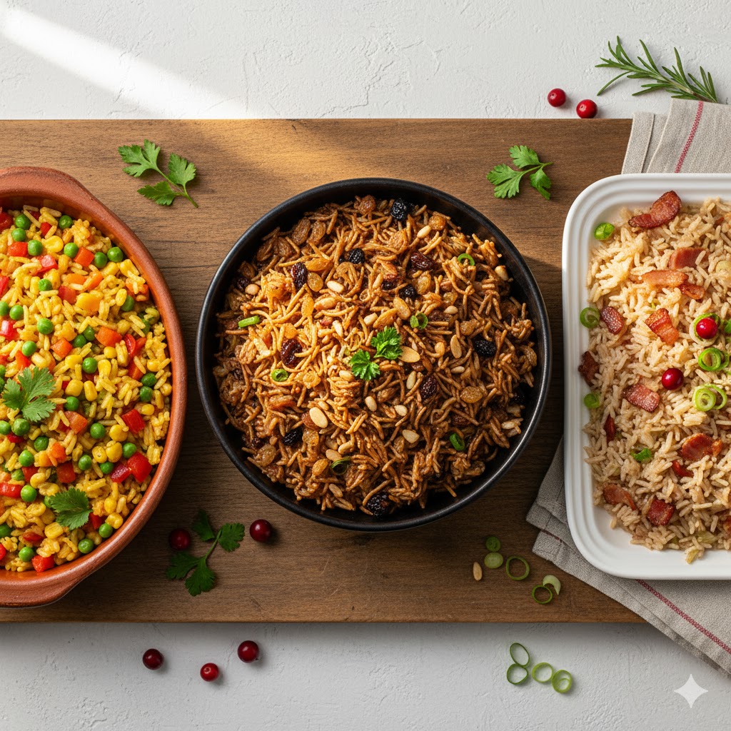 Arróz Arábe, Arróz navideño (mezcla especial con tocino, pecanas y pasas.), Arroz a la Jardinera Navideño (Colorido y ligero, con verduras frescas)