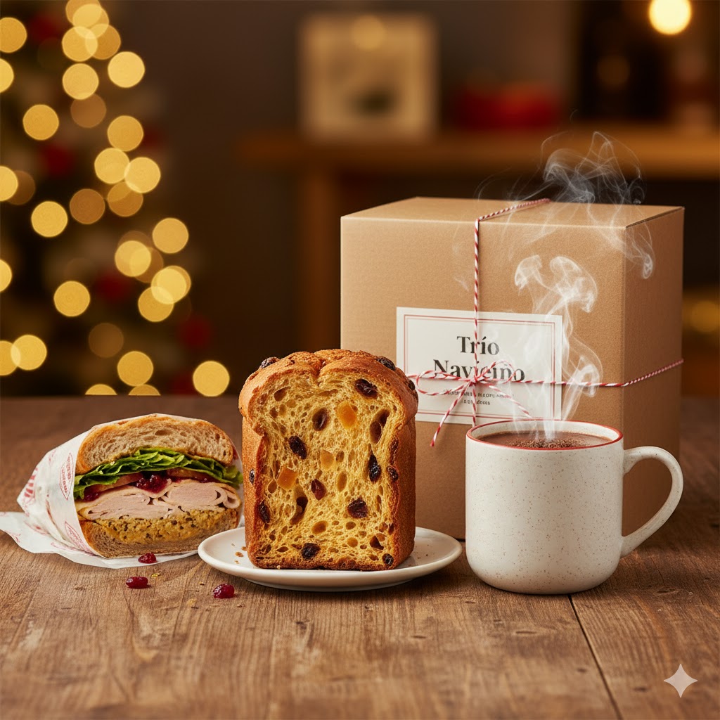Panetón + chocolate caliente + sándwich a elección.